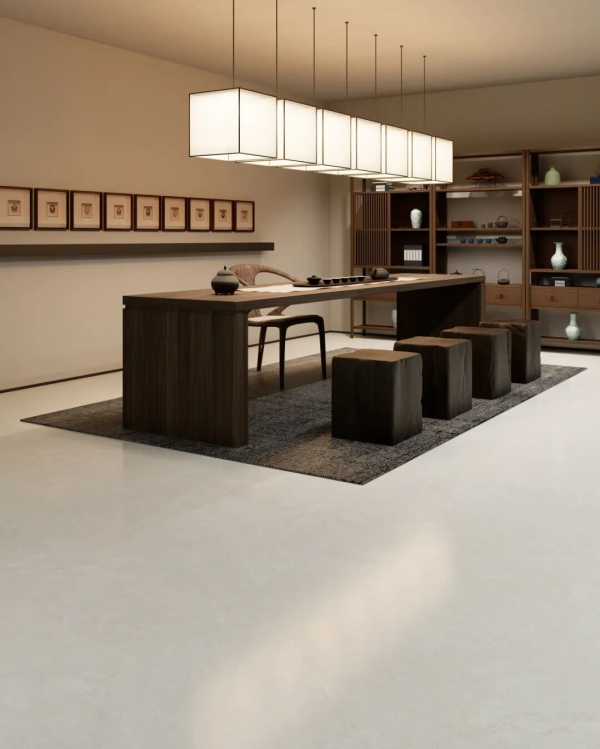 復嶂層巒一徑紓,綠筠蒼栝密還疏,凹凸有致的復刻紋理如遠眺的山巒,層連疊嶂地向遠方舒展。與中式簡約線條的竹節造型燈具,讓茶室禪意更濃。