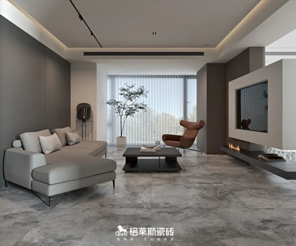灰色大理石紋理的質感高級,為空間奠定大氣基底,與造型簡約且具藝術感的沙發、單人椅相得益彰,材質質感突出。整體以灰白為主色調高級協調,搭配壁爐、燈具、綠植等軟裝細節,既讓空間兼具藝術感與生活氣息,又借由瓷磚與軟裝的融合,營造出雅致且富有層次的現代家居氛圍。