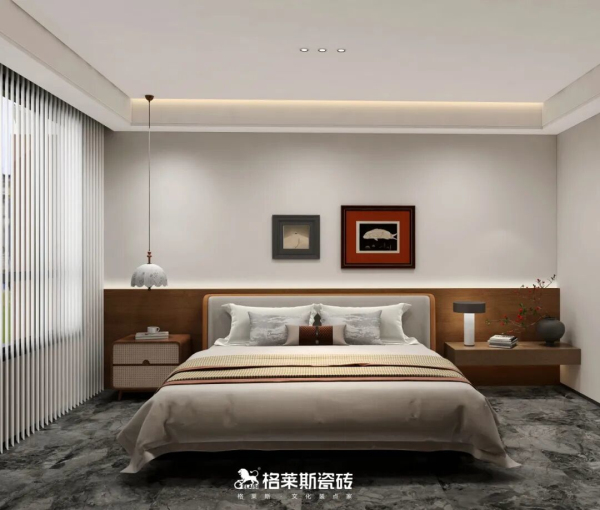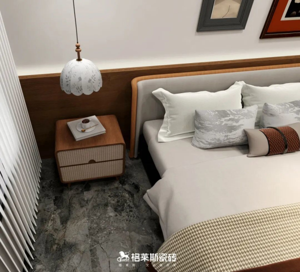 臥室使用搭配木質家居,紅棕掛畫作為點綴,濃厚的復古意蘊讓人溫暖舒心。瓷磚獨特的干粒釉配方與立體柔拋技術,既保留了自然原生的質感與堅韌,更賦予了空間如絲織物般的柔美。