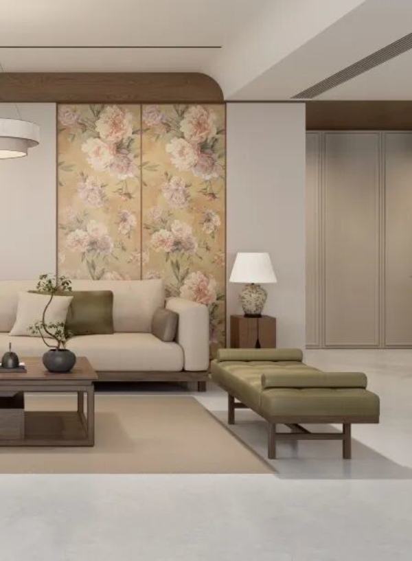 溫馨的暖杏墻面點綴鋪貼寓意吉祥富貴的洛神·花田花片,東方花藝散發出高雅氣息,簡單提升空間氣韻。搭配禪意燈具、綠植和國風擺件,一個寧靜而富有禪意的當代東方空間便油然而生。