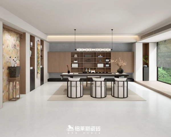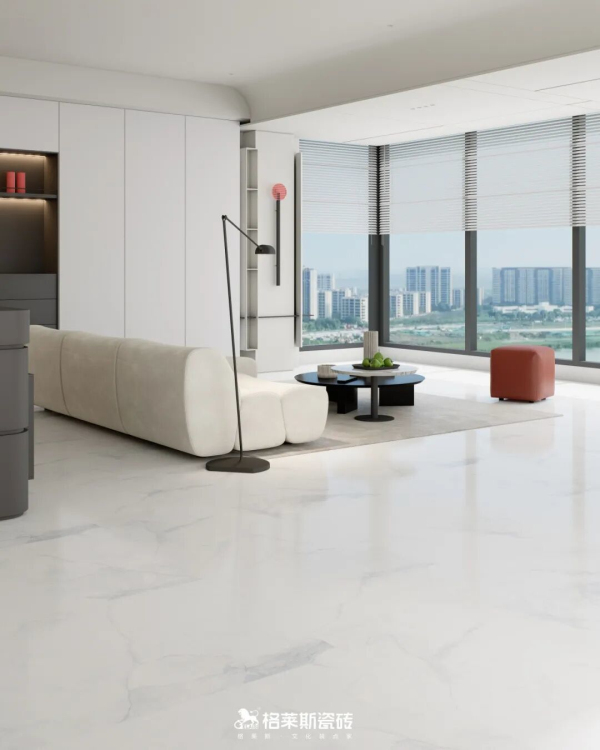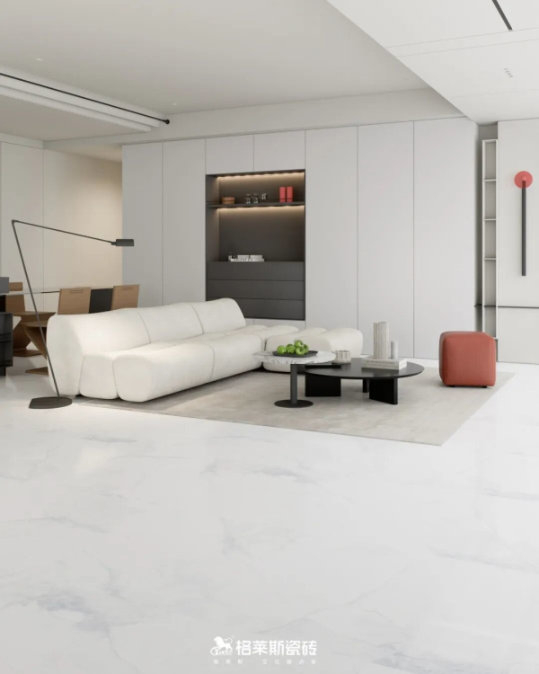 素白色系大理石紋理瓷磚質感通透、紋理大氣,光澤15~25度之間柔和護眼,讓視覺達到舒適平衡。以高調的硬裝質感成為空間視覺焦點;背景墻采用大面積白色柜體與深色板材拼接,在材質與造型設計上盡顯硬裝的極簡張力。