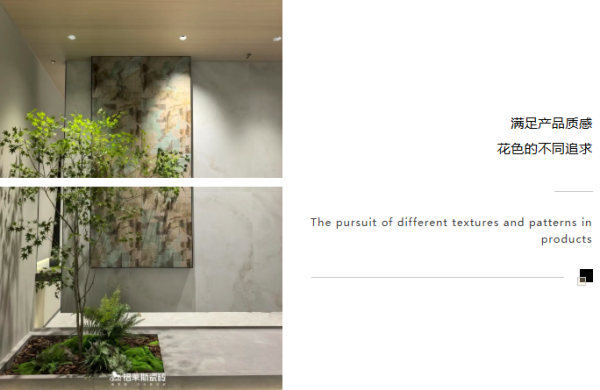 產(chǎn)品展示區(qū)以直板、斜板單片或組合方式,其中較亮眼的是900x1800mm以橫向三片產(chǎn)品組合展現(xiàn),突出產(chǎn)品紋理的流暢銜接及紋理花色的大視覺。