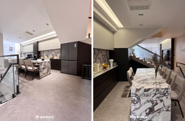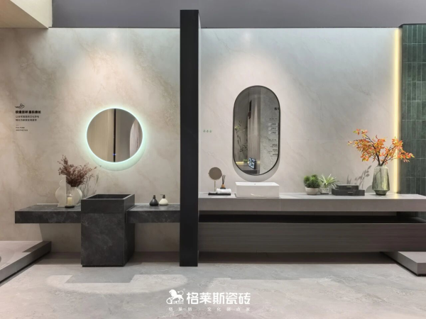 總部展廳煥新布局,圍繞750x1500mm、900x1800mm兩大規(guī)格展開,融合糖果釉,新大理石,珍珠釉、結(jié)晶釉等多種工藝,精準對應多元風格需求,涵蓋新中式、輕奢、現(xiàn)代簡約、混搭風等。不僅呈現(xiàn)高端瓷磚的品質(zhì)表現(xiàn),更提供從材質(zhì)選擇、搭配方案到空間靈感的一體化服務,滿足消費者對產(chǎn)品質(zhì)感花色的不同追求。