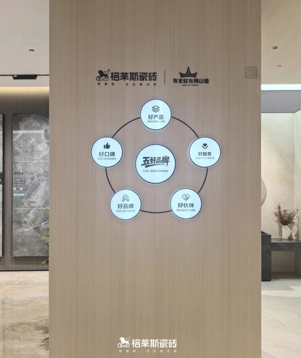格萊斯瓷磚總部以“傳承經(jīng)典文化”為內(nèi)核,通過場景化設計與“五好品牌”的融合展示,將傳統(tǒng)文化的厚重與現(xiàn)代質(zhì)感的追求無縫銜接,實現(xiàn)美學表達的融會貫通。