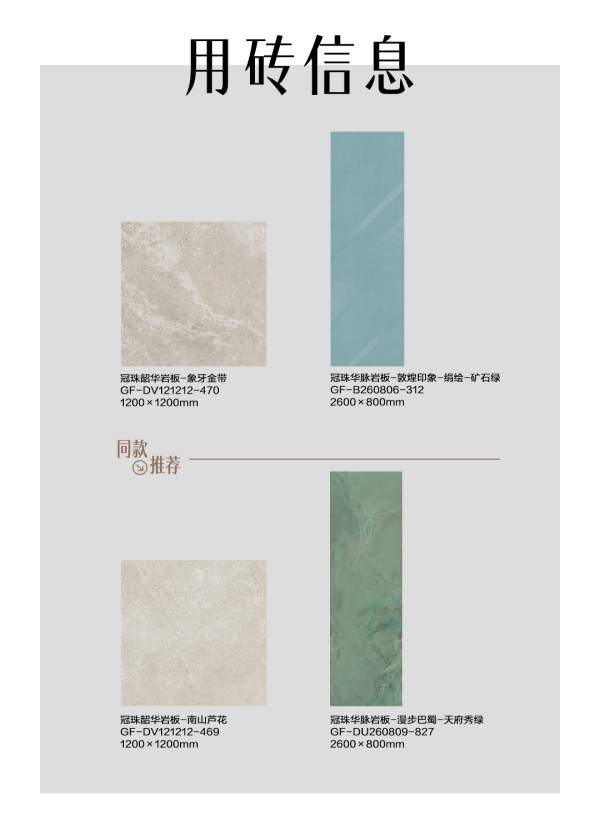 “我們?cè)诘孛嫱ㄤ亣?guó)色巖板冠珠韶華「象牙金帶」,正是希望將文化意境融入空間體驗(yàn)。溫潤(rùn)的象牙底色,磚面觸感細(xì)膩立體,仿佛為整個(gè)空間蒙上一層靜謐的時(shí)光濾鏡,讓人文藝術(shù)在細(xì)節(jié)中悄然流淌。”主理人俞棡評(píng)價(jià)。