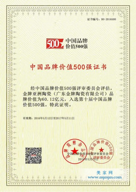 2016年5月12日,第十屆中國(guó)品牌價(jià)值500強(qiáng)榜單揭曉。金牌亞洲陶瓷以60.12億元榮登“中國(guó)品牌價(jià)值500強(qiáng)”榜單,位居全國(guó)建材行業(yè)前列。這是金牌亞洲陶瓷通過(guò)努力實(shí)干改革,發(fā)展品牌,在市場(chǎng)上取得品牌溢價(jià)的提升,讓品牌的價(jià)值在2015年的基礎(chǔ)上飆升了近10億。