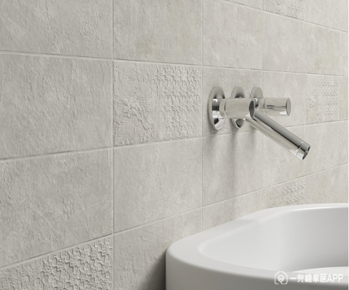 這兩款都是帶浮雕效果的,柔光砂系列是每塊小磚有回字邊,還有菱形和印花的浮雕花紋;卡倫堡系列是有點巖石紋路。兩款比常見的平滑款式更多了一種裝飾效果,凹凸有致,原來也可以用在這啊!