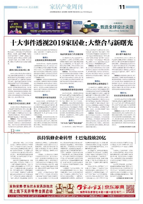 即將過去的2019年,家居行業發生了哪些大事兒?北京商報家居產業周刊根據影響力、關注度、啟發性等維度,甄選出2019年度中國家居十大事件,反映出企業的興與衰、甜與苦、喜與悲,也折射出家居人的追求與無奈、開心與失意、希望與迷茫,透視出中國家居行業的大整合與新曙光。