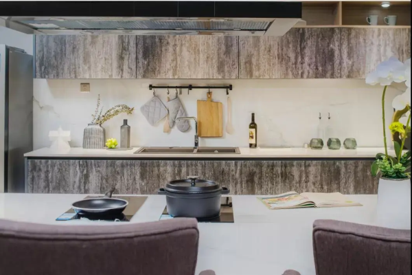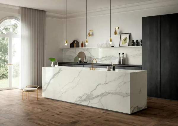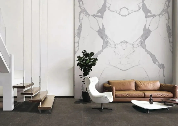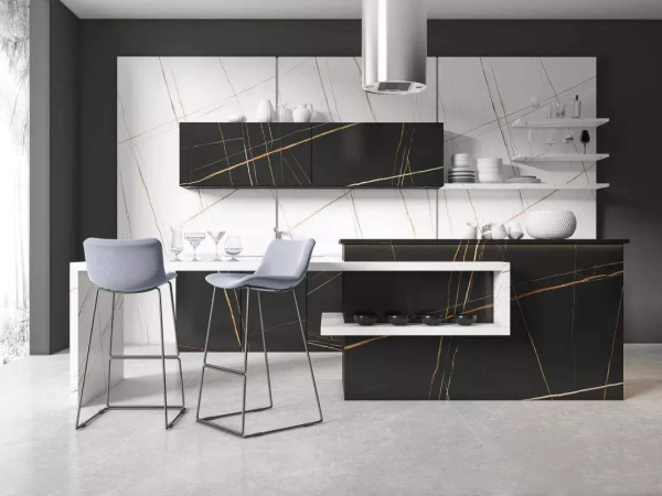 巖板憑借其獨有的產品屬性,賦予了其超越一般瓷磚的物理性能。除了傳統作用的鋪地上墻,還能用作樓梯、盆景陳設、洗手臺、前臺、茶幾、櫥柜等多個方面應用,實現瓷磚與家居的統一結合,實現空間一體化。