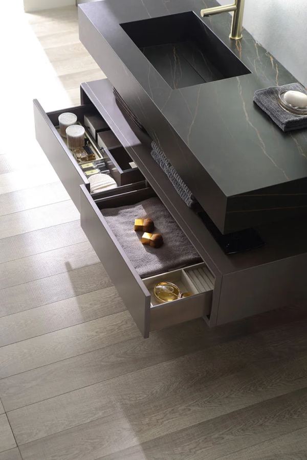 巖板采用全通體技術鍛造,在韌性上優于傳統大板的同時,加入全通體技術材料,使得巖板表里如一。巖板表面處理技術非常精細和復雜,特別對還原石材的通透感和表面紋理手感都有極高要求。