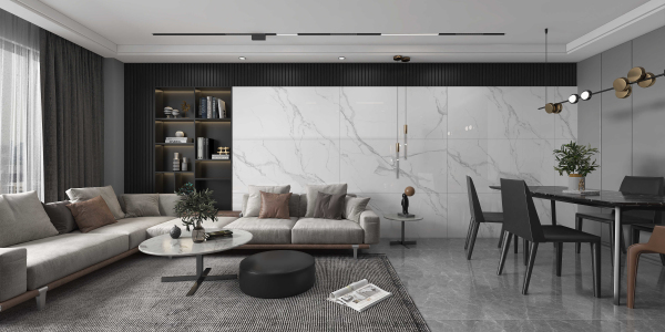 亮光面通透瑩亮,淺灰色的水墨紋理滲透在純凈的白色磚面,